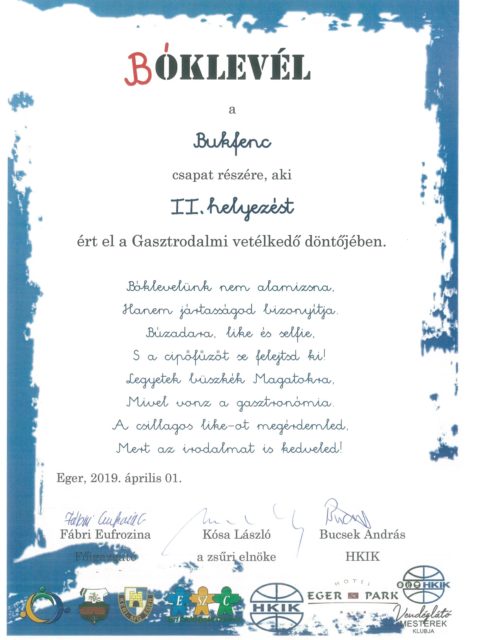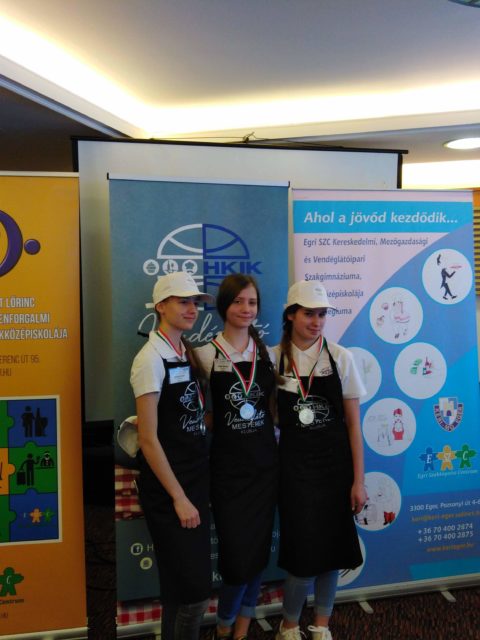 Az Egri Szakképzési Centrum által meghirdetett, a Heves Megyei Kereskedelmi és Iparkamara által támogatott Gasztrodalmi vetélkedő döntőjében iskolánk csapata II. helyezést ért el. A csapat tagjai: Danyi Anna Lili 11. D, Varsányi Eszter és Zsiger Dorottya 11. C osztályos tanulók.